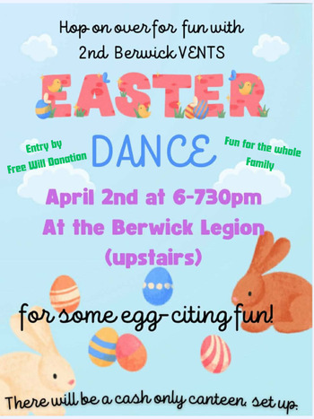 Easter Family Dance. Fun for all ages. Fundraiser for 2nd Berwick Ventures trip to New Brunswick. Free will entry. Cash canteen.