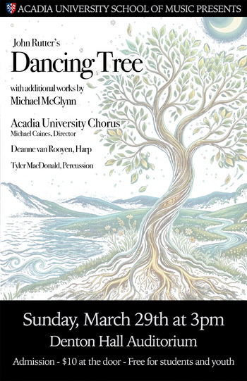 Join the Acadia University Chorus for their annual Spring Concert, this year entitled "Dancing Tree", a new work from John Rutter. Dancing Tree is a captivating set of eight songs for mixed choir and harp that draws upon the poetry of Cornish writer Charles Causley. The work presents a rich selection of Causley’s texts, primarily drawn from his Collected Poems for Children and illustrative of his simple yet evocative style that conveys emotion and connection to folklore while being deeply rooted in nature. Rutter employs a diversity of musical styles and uses his choral and instrumental forces to perfectly capture the spirit of the texts, including the lilting ‘Stone in the water’, the lyrical ‘In my garden’, and the waltz-like ‘Dandelion’.