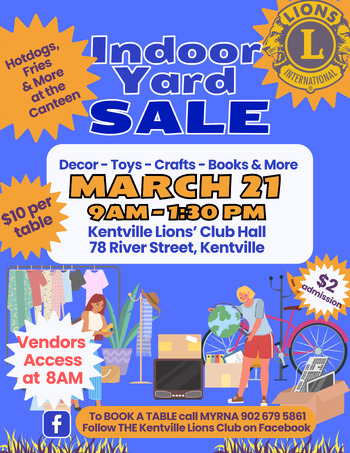 Pricing: $2 admission going to the good work of the Kentville Lions Club. $10 / Table