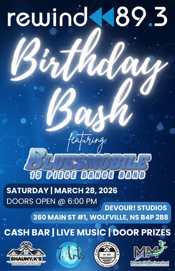 Join Rewind 89.3 for an exclusive birthday bash packed with classic hits, live music from Bluesmobile, and plenty of party vibes. Enjoy a cash bar, door prizes, giveaways, and fun photo ops throughout the night as we celebrate five incredible years with the best listeners in the Annapolis Valley.