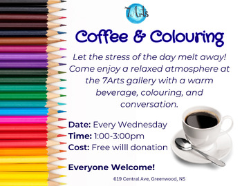 Let the stress of the day melt away! Come enjoy a relaxed atmosphere at the 7Arts gallery with a warm beverage, colouring, and conversation. All ages welcome!
