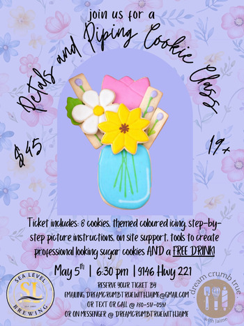 Sweet themed Mother's Day Sugar Cookie decorating class. All supplies and directions provided. Price includes a beverage.