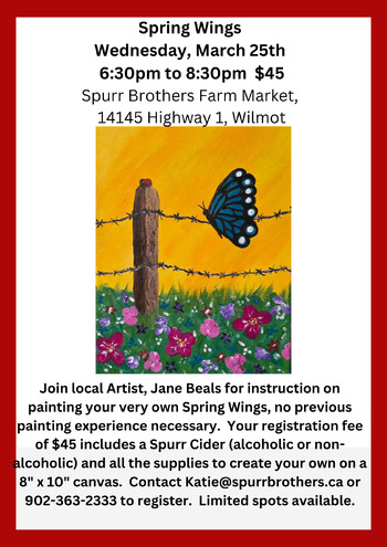 Join local Artist, Jane Beals for instruction on painting your very own Spring Wings, no previous painting experience necessary.