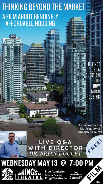 FREE SCREENING of a new Canadian documentary that looks beyond market forces to find real solutions to the housing crisis is coming to Annapolis Royal, complete with a live Q&A with the filmmaker.