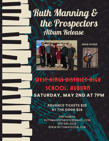 Ruth and the Prospectors will introduce music from Ruth's brand new album at West Kings District High School in Auburn on Saturday, May 2nd at 7pm. Carson Fullerton will open the show. Advance tickets are $25 and at the door $28. Call Ruth at 902-691-2638, email [email protected] or purchase tickets at www.ruthmanning.com.