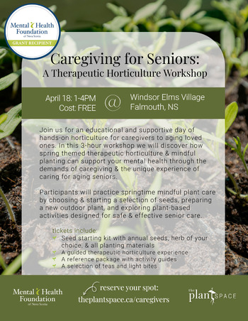Find your community and join us for an educational and supportive day of hands-on horticulture for caregivers to aging loved ones. In this 3 hour workshop we will discover how spring themed therapeutic horticulture and mindful planting can support your mental health through the demands of caregiving and the unique experience of caring for aging seniors.