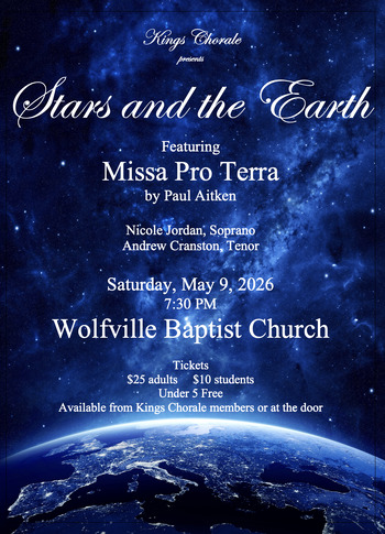 Join us as we explore music about the stars and earth! This concert features "Galaxias" by Argentinian composer Santiago Veros, "Stars" by Ericks Esenvalds, and "Missa Pro Terra: A Mass for the Earth" by Parrsboro composer Paul Aitkin. Special guest soloists include soprano Nicole Jordan and tenor Andrew Cranston.