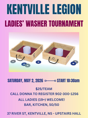 ATTENTION ALL LADY WASHER TOSS PLAYERS!! Kentville Legion will be hosting a Ladies Only Washer Tournament. All Ladies (19+) welcome - you don't have to be a Legion Member.