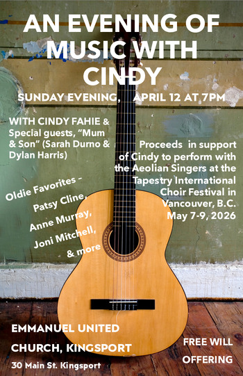 Enjoy a delightful evening of music with Cindy Fahie and other performers as they entertain us with some of our old favourite tunes. Freewill donations appreciated. Proceeds in support of Cindy’s opportunity to perform with the Aeolian Singers at the Tapestry International Choir Festival in Vancouver, B.C., May 7-9, 2026.