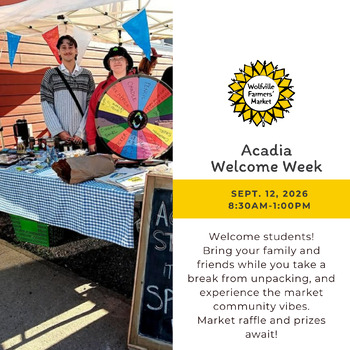 We are so excited to welcome Acadia students back to the Wolfville Farmers' Market on September 13th. Come to our Acadia Welcome booth at the entrance to meet your Acadia Student Union President and try our Spin to Win Wheel for a chance to win Market Money, Market Swag or unique prizes from our amazing vendors. Bring a friend, come with a club or class and experience the market's community vibe. We're open year-round and hope to be the best part of your week.