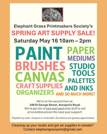 The proceeds from our yardsale will help Elephant Grass Printmakers, a registered non profit Society, stock our studio with paper, ink, barens and othe materials for use by all members, visiting printmakers and people taking workshops with us.