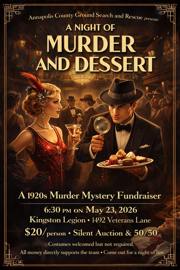 A 1920's Murder Mystery and Desserts. Join us on Sat., May 23rd for an evening of fun, murder and desserts in support of the Annapolis Co., Ground Search & Rescue. Silent Auction, 50/50 draw, photo booth and prize for best costume (costumes encouraged, but not necessary). All proceeds go to AVGSR for equipment and supplies. Cost $20 at the door. Time: 6:30pm - After supper, leave room for desserts!