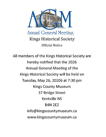 All members of the Kings Historical Society are invited to join us for the 2026 Annual General Meeting on Tuesday, May 26, 2026, at 7:30 p.m. at the Kings County Museum.