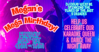 DJ Doug will be spinning tunes that span the last 5 decades. Come dance the night away, from 4-9pm and celebrate another trip around the sun for our resident karaoke queen Megan!