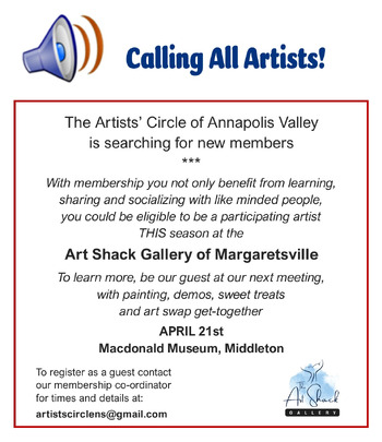 If you're an artist in the Annapolis Valley, come be our guest at our next get together & meeting of The Artists' Circle. As our group is growing, join us to see what we're all about!