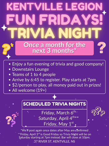 | Mon Apr 20, 7pm Kentville Legion Volunteer Meeting & Appreciation |