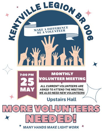 There’s lots of different positions to fill - something for everyone. Every little bit of time you can spare would be greatly appreciated so come to the meeting to see how you can help. All current Volunteers are asked to attend plus WE NEED NEW VOLUNTEERS! You do not have to be a Legion Member to volunteer. Bring your spouse. friends, co-workers, neighbours, anyone who is community minded and would like to pitch in.