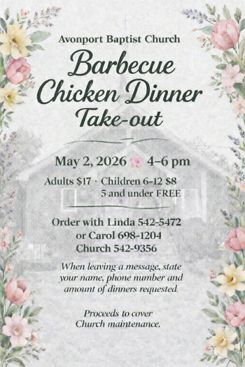 Barbecue Chicken Supper (Take Out/Drive Thru); Pick Up 4-6 pm.