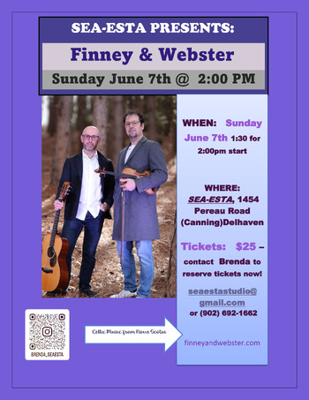 Finney & Webster are a Celtic music duo rooted in Nova Scotia, Canada. Fiddler and composer Jeremy Finney — whose debut album earned a Music Nova Scotia nomination — joins Scottish-born guitarist, bouzouki player, and vocalist Andy Webster in a partnership that draws from the traditions of Scotland, Ireland, and Atlantic Canada. Together they craft a warm, full-bodied sound built on lyrical tune sets, compelling original compositions, and songs that linger long after the last note fades. Whether on a concert stage or in an intimate house concert, Finney & Webster deliver a captivating performance rooted in landscape and story.