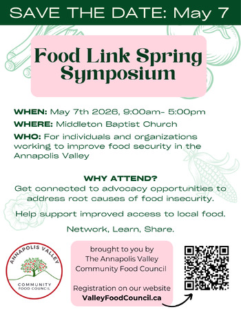 The Annapolis Valley Community Food Council is hosting its second annual Food Link Spring Symposium. The purpose of this grassroots gathering is to better connect and equip individuals and organizations working to improve food security in the Annapolis Valley.