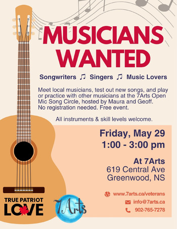 Come to the 7Arts studio to jam with musicians Maura & Geoff. You are welcome to bring an instrument, use one of ours, or just enjoy some live music. All veterans, friends, family, and the public are welcome.