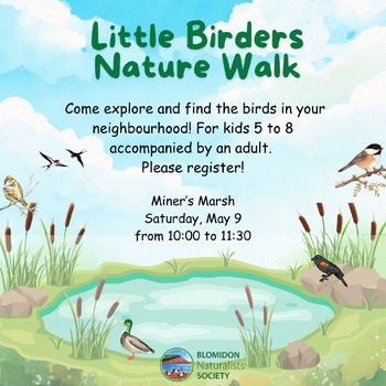 Come join Linda Hutchinson to explore and find the birds in Miner’s Marsh! This is a family event suitable for children between 5 and 8 years old. As a group, we will walk around the Marsh with fun engaging activities along the way. We may even some Pileated Woodpeckers feeding their babies!