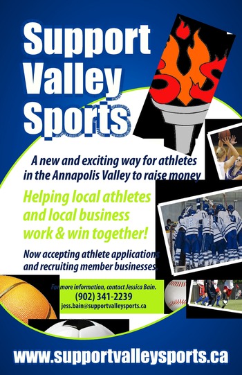 Support Valley Sports, a Non Profit Association aimed at helping young athletes in the Valley raise money, is holding an Information Session on Monday April 16th at 7pm in the Central Kings High School cafeteria. If you are a business owner who enjoys supporting local athletes, or a sports team or athlete looking to raise some money, you don’t want to miss out. Come discover how Support Valley Sports is helping local athletes and local businesses work and win together! For more information contact Jessica Bain at 341-2239, or [email protected]