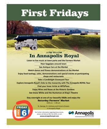 Enjoy music, dance, fitness demonstrations throughout Town. Evening shopping featuring demonstrations, refreshments and in-store specials at participating shops and restaurants.Special tours (admission charged). Fun for the entire family. Special events at ARTsPlace, the Historic Gardens (admission charged), and King's Theatre (admission charged). Stay overnight at one of our beautiful B&Bs and enjoy the Farmers Market on Saturday morning, 8 a.m. to 1 p.m. Most