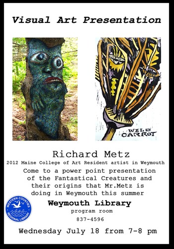 Meet some of the fantastical creatures created by artist Richard Metz of the Maine College of Art. The artist will display and discuss his creations during a PowerPoint presentation of his work. The Weymouth Waterfront Library is located at 4577 Highway 1 in Weymouth. For more information, call the library at 837-4596 or visit www.westerncounties.ca.