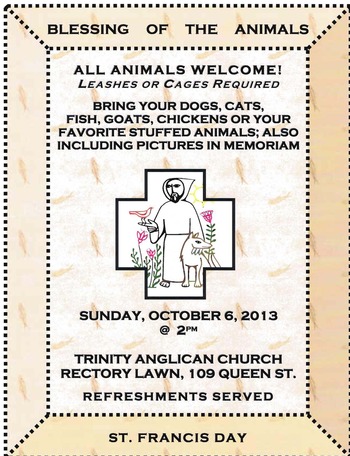 All Animals Welcome! {leashes or cages required} St. Francis Day. Bring your dogs, cats, fish, goats, chickens or your favorite stuffed animal! Pictures In Memoriam also welcomed. To be held on the Rectory Lawn. Refreshments will be served. Free will offering.