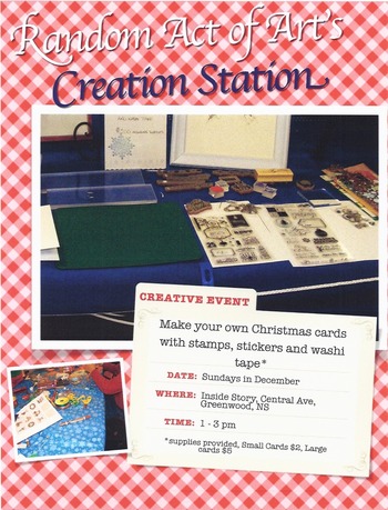 Drop in to the Inside Story to make your own Christmas Cards at the Random Act of Art Creation Station. Artist Jan Stride will be providing supplies and assistance. Appropriate for ages 3 to 90.