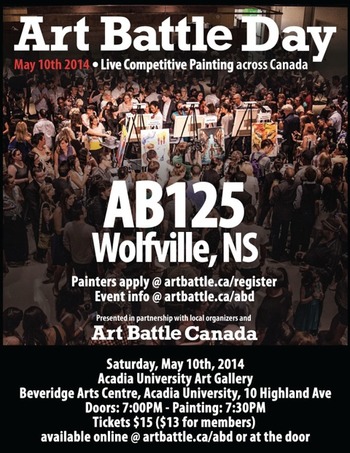 Art Battle 125 in Wolfville will showcase NS artists. Art Battle is a national event of live competitive painting, with the finale in Toronto. Painters create the best work they can across three rounds of public painting. The audience votes for the winners of each round, and the single winner of each event, who go on to a provincial competition. Works are available for silent auction at the end of the evening. Hors d’oeuvres and cash bar. This is an event not to miss.