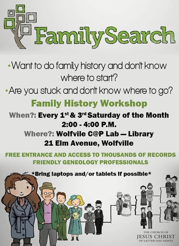 There will be a family history workshop in the C@P lab above the Wolfville Memorial Library. There is one-on-one help with getting started on your family history and/or working on those lines that are a little more tricky. Come on in and learn about your family!