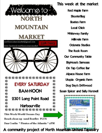 Fresh produce, fresh fish, art, baked goods, good food to eat, coffee bar, rocks (not just any rocks), mingling and connecting. Come "up the mountain" to do your shopping and hang out, enjoy the salty air and view ... and this week, activities tied in with World Oceans Day. Check the North Mountain United Tapestry Facebook page for full details on this event.