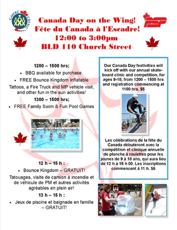 The 14 Wing Community Centre and Greenwood Military Family Resource Centre have once again partnered to offer our annual Canada Day on the Wing event. This will be a great way to celebrate Canada’s birthday with our CF families and the surrounding communities.