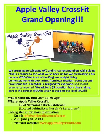 We are going to celebrate AVC and its current members while giving others a chance to see what we've been up to! We are hosting a fun partner WOD (Work out of the Day) and weight lifting demonstration with door prizes from local retailers, come out and have some fun! The WOD is designed for everyone, no CrossFit experience required! We ask for a $5 donation from those taking part in the partner WOD be given to support our local SPCA!!!