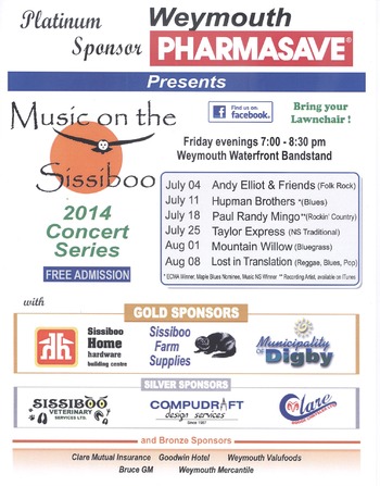 “Music on the Sissiboo - 2014” is a weekly concert series held along the waterfront on Friday evenings during the summer. The series showcases local musicians and offers a variety of music genres from folk to rock to bluegrass and more. Thanks to our sponsors, all concerts are FREE to the public, providing incentive for locals and tourists alike to visit, shop, and explore our downtown this summer.