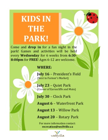 Come and drop in for a fun night in the park! Games and activities will be held every Wednesday with Kellie Shillington. Each week will feature a different park in Wolfville, so take a look on our poster for weekly park placements! This program will be free, and for children aged 6-12!