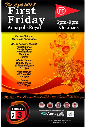 Join Annapolis Royal for October First Friday! Free Music, zumba demos, candy apples, pumpkin pie, crafts for the kids and horse rides!!!