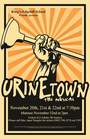 King's-Edgehill School presents "Urinetown." One of the most uproariously funny musicals in recent years, URINETOWN is a hilarious tale of greed, corruption, love, and revolution in a time when water is worth its weight in gold.