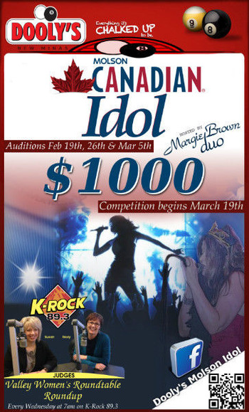 A vocal competition! Win $1000 with Dooly's Molson Idol. Auditions Feb 19, 26th and March 5 and the competition starts March 19. Come to sing, to vote, or just to listen to this great local talent.