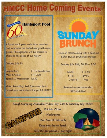 Calling all past staff and swim team members of the Hantsport Pool! Open since 1955 in one capacity or another. This is a great 'reunion' event to see old friends, students, the pool and HMCC grounds, take pictures, share stories and so much more!!! Please contact to say if coming or come on the day. Spread the word of this great event. Dignitaries on hand. Free swim in the pool. Brunch available at Churchill House between 10:30 and 1:30 - reservations recommended.
