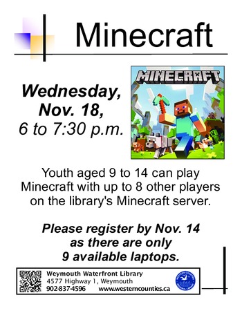 Learn to play, or enjoy group play of, Minecraft with up to nine other players on the library's Minecraft server. This program is for youth aged nine to 14. Participants are asked to register by Tuesday, Nov. 17 as space is limited to nine players.