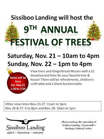 Come and view the beautifully and uniquely decorated Christmas trees, vote on your favorite, partake of warm apple cider and Christmas treat. There will also be a Silent Auction table with lots of items for you to bid on. All profits go to Sissiboo Landing, Weymouth's Heritage Cultural Center.