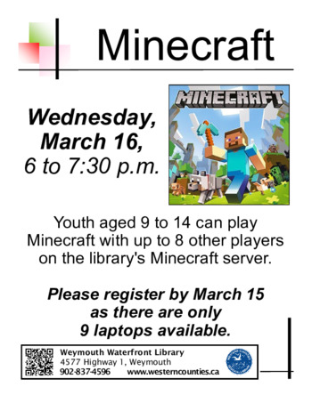 Youth aged nine to 14 can play Minecraft with up to eight other players on the library's Minecraft server. Space is limited so please register no later than March 15 by contacting the library.