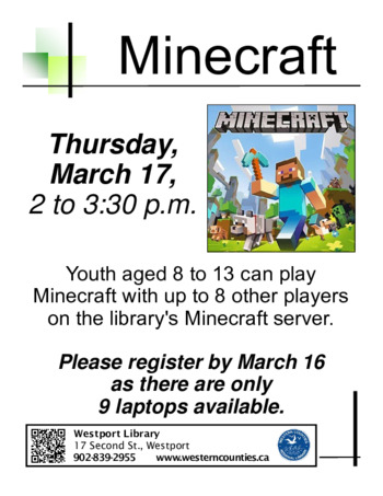 Youth aged nine to 13 spend an afternoon playing Minecraft with up to eight other players on the library's Minecraft server. Space is limited so please register no later than March 15 by contacting the library.