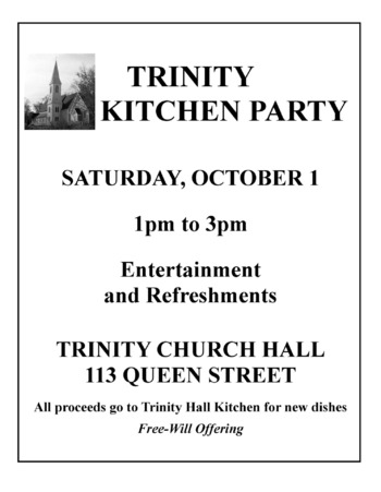Kitchen Party. Great entertainment; refreshments served. All proceeds go to Trinity Hall kitchen for new dishes. Free-will offering.