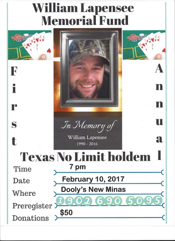 We are having a first annual Texas no limit hold'em fundraiser in support of the William Lapensee Memorial fund. To pre register or more information please call 902 690 5095.