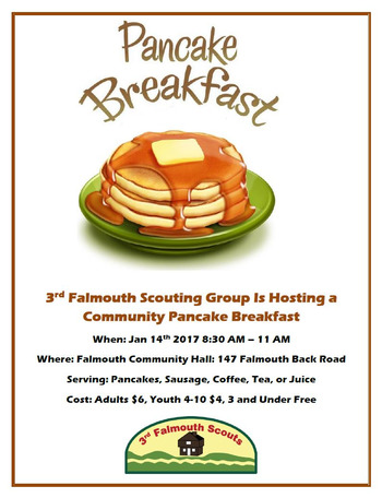 3rd Falmouth Scouting will be hosting a Community Pancake Breakfast. We are hoping to get the Community out to enjoy a meal. It will be a great opportunity for people to socialize and enjoy the company of friends and neighbors, or even meet some new people.
