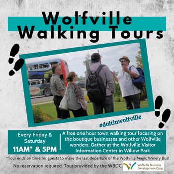 A complimentary one hour tour of the vibrant community of Wolfville, Nova Scotia. Learn about the history of the town as well as where the hot spots are today. Guests are asked to meet at the Wolfville Visitor Information Center in Willow Park. Tour is provided by the Wolfville Business Development Corporation.